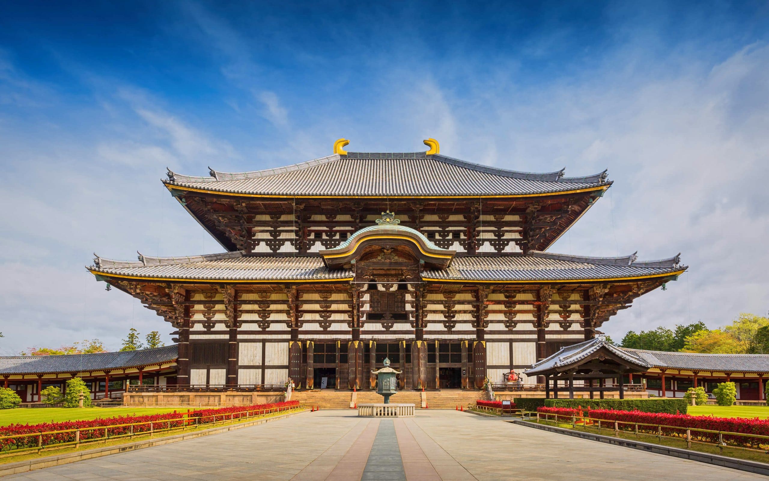 Современная Нара – небольшой городок, который находится в часе езды от Киото. Когда-то он был столицей, поэтому тут точно есть что посмотреть. Местные храмы являются частью мирового культурного достояния ЮНЕСКО. Храмовый комплекс Большого Будды Тодайдзи – величественное строение. Оно считается одним из самых крупных мировых деревянных построек. Впечатляет и бронзовая статуя, высота которой около 15 м. Также на территории имеется множество других уникальных объектов. Божествам-защитникам древней столицы посвящено святилище Касуга Тайся, которое окружено каменными фонариками. Еще одной отличительной чертой Нары являются священные олени, свободно гуляющие по улицам. Их охраняет государство. Они не боятся туристов и с удовольствием лакомятся предлагаемыми подношениями.